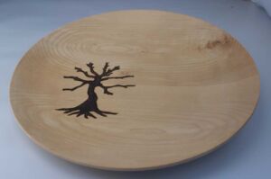 Woodturned lidded box (lid open) made from maple; 3.75"x2.5"; coloured with India Ink & textured